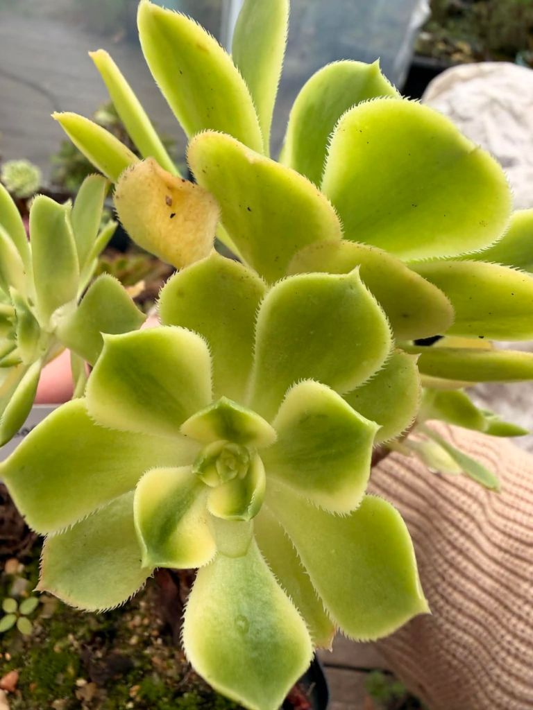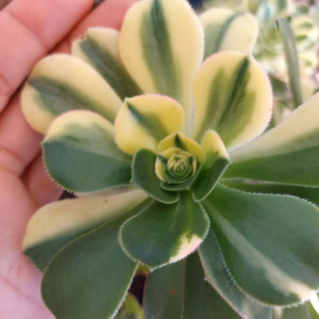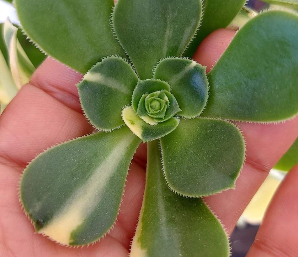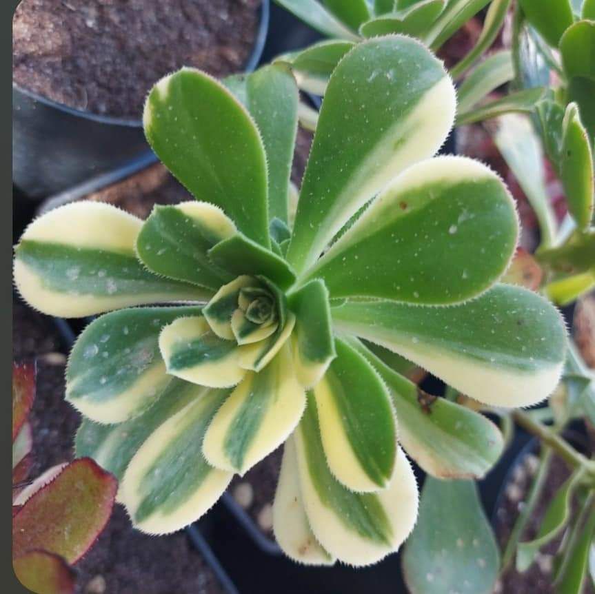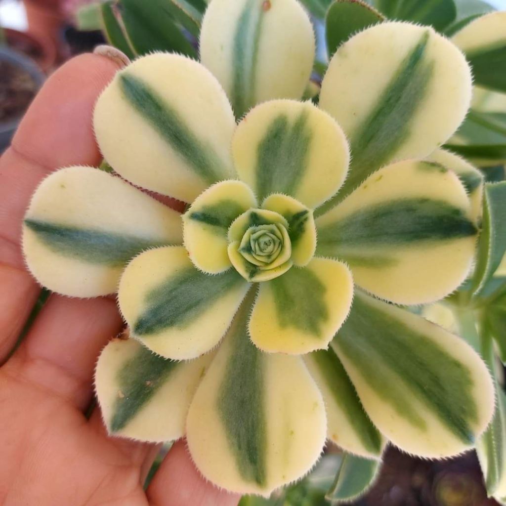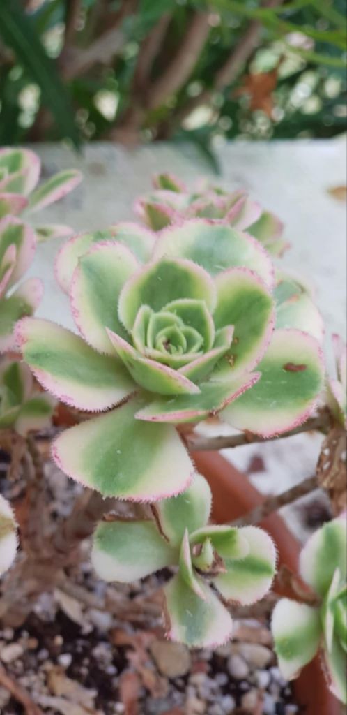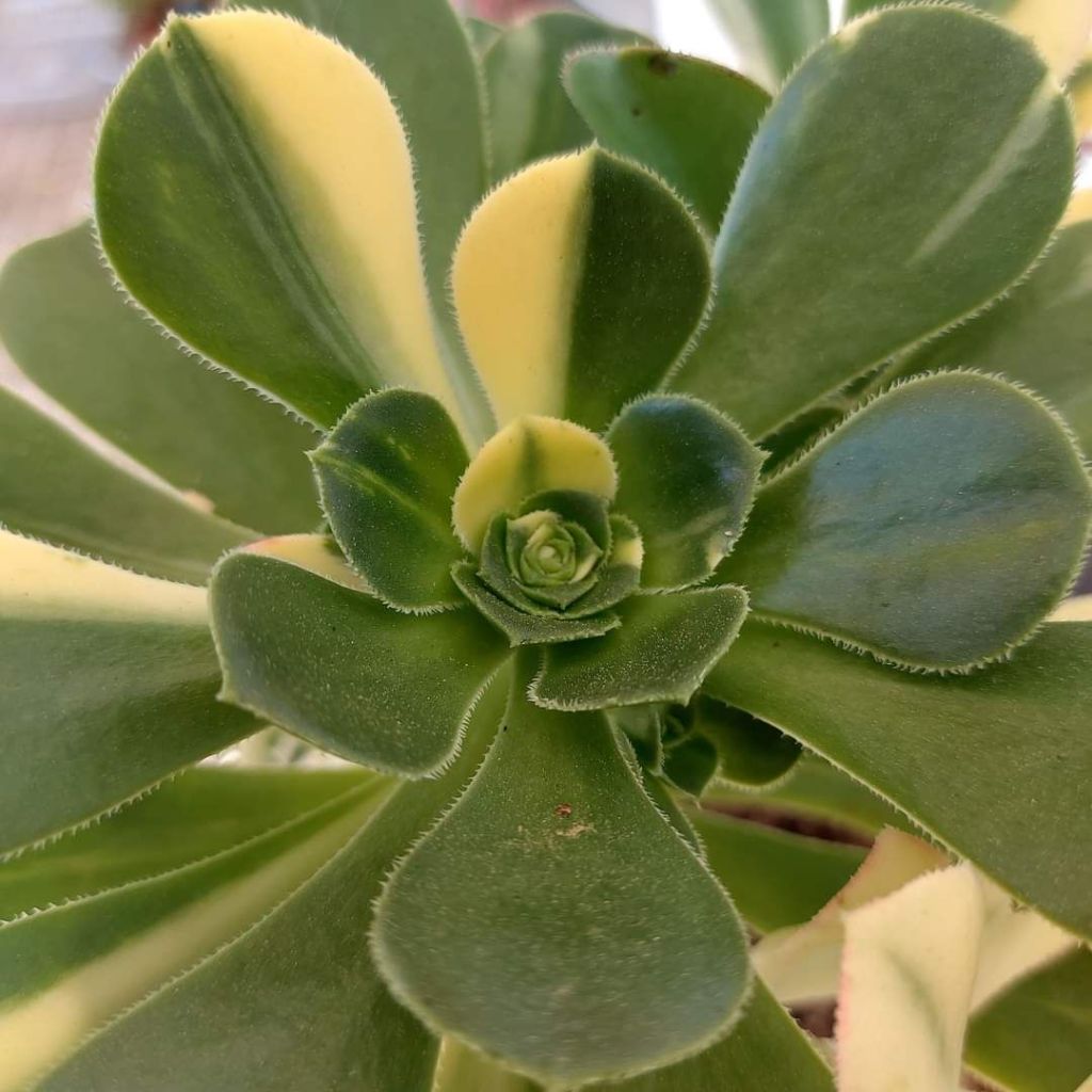 En 2022, une amie de Sofia Cardoso qui se nomme Paula Silva a envoyé une photo d’un de ses Aeonium Santuario avec un rejet qui avait quelques feuilles variegata (voir photos ci-dessous).