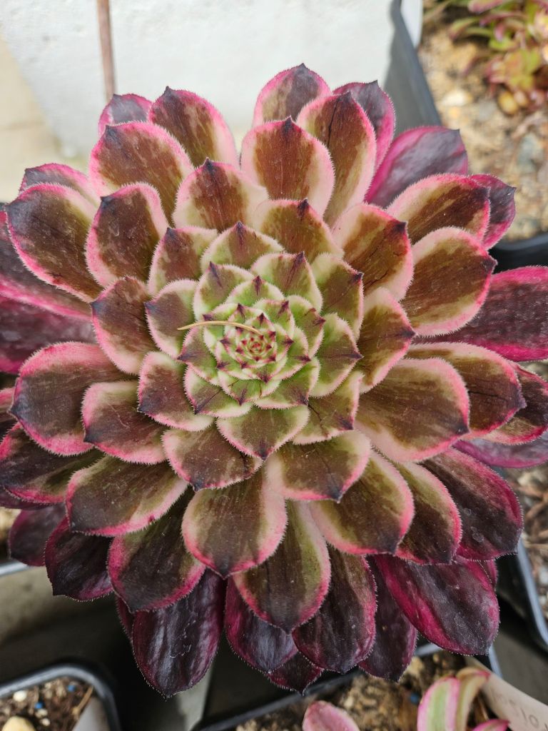 ORIGINE : Issu de la mutation de l’Aeonium ‘Ink Painting’ qui est lui-même issu de la mutation de l’Aeonium ‘Mardi Gras’.