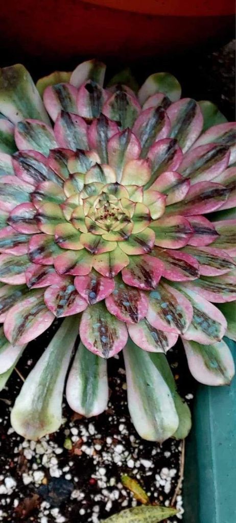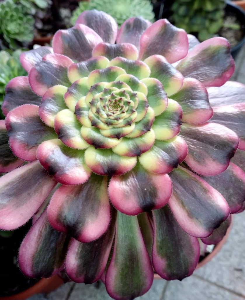 En plein hiver lorsque la luminosité est faible, son feuillage est constitué d’une bande centrale verte et de bandes latérales couleur jaune/crème comme la plupart des Aeonium issus de mutations de ‘Mardi Gras’. Plus la luminosité va augmenter, plus la feuille va se teinter d’un rose pourpre sur les bordures latérales et la bande centrale va avoir tendance à foncer. Lors de cette période de croissance, la différence avec l’Aeonium ‘Venus’ est très difficile à percevoir dixit les producteurs chinois.