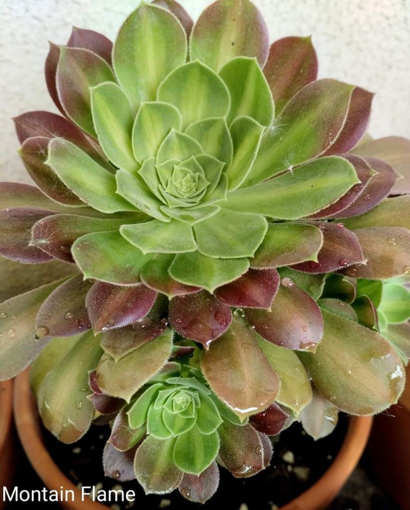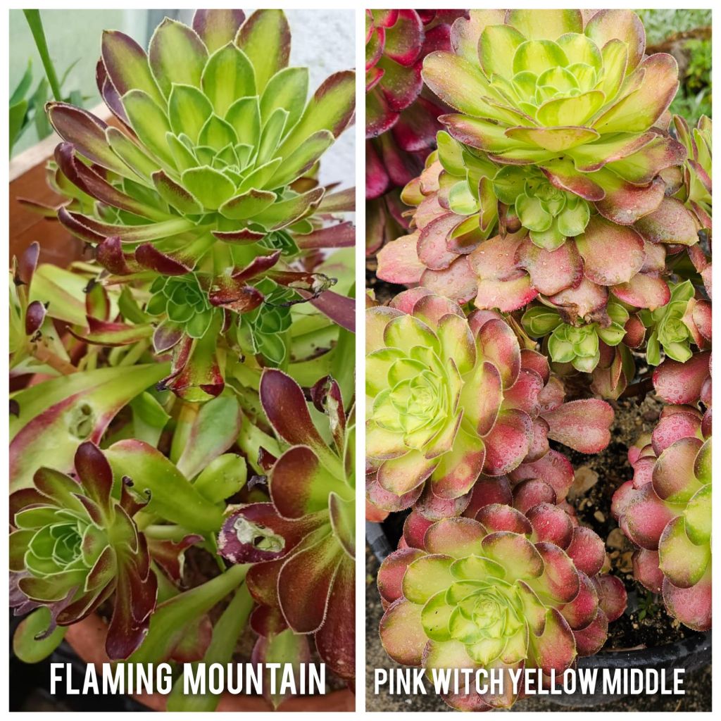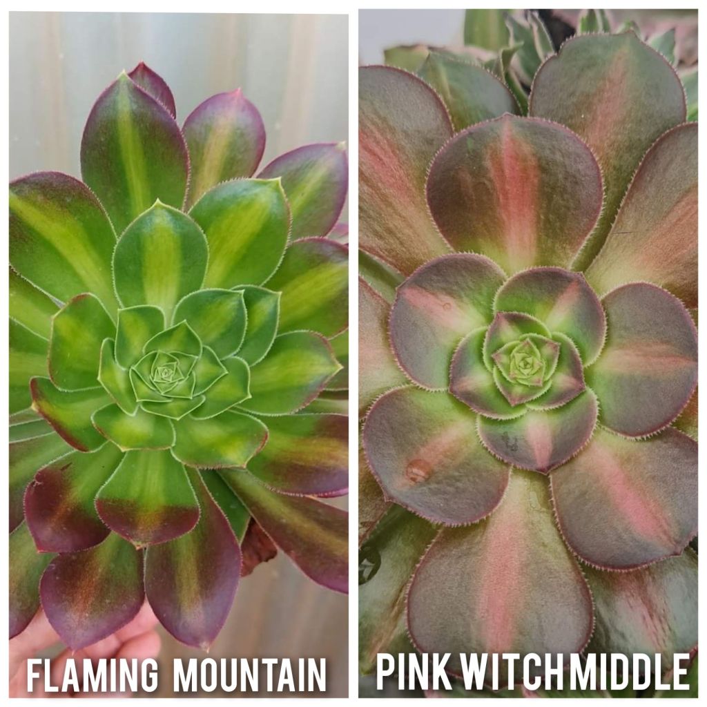 La principale différence entre ‘Flaming Mountain’ et ‘Pink Witch Middle’ réside dans le cœur de la rosette qui dans le cadre de ‘Flaming Mountain’ ne se colore pas contrairement à ‘Pink Witch Middle’