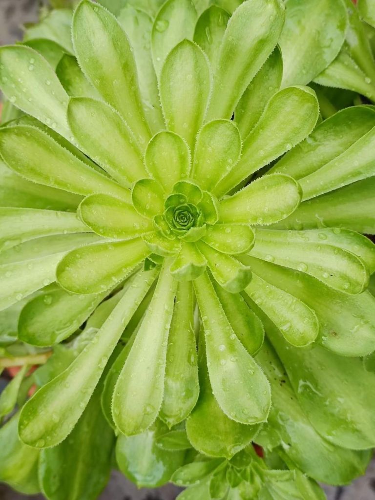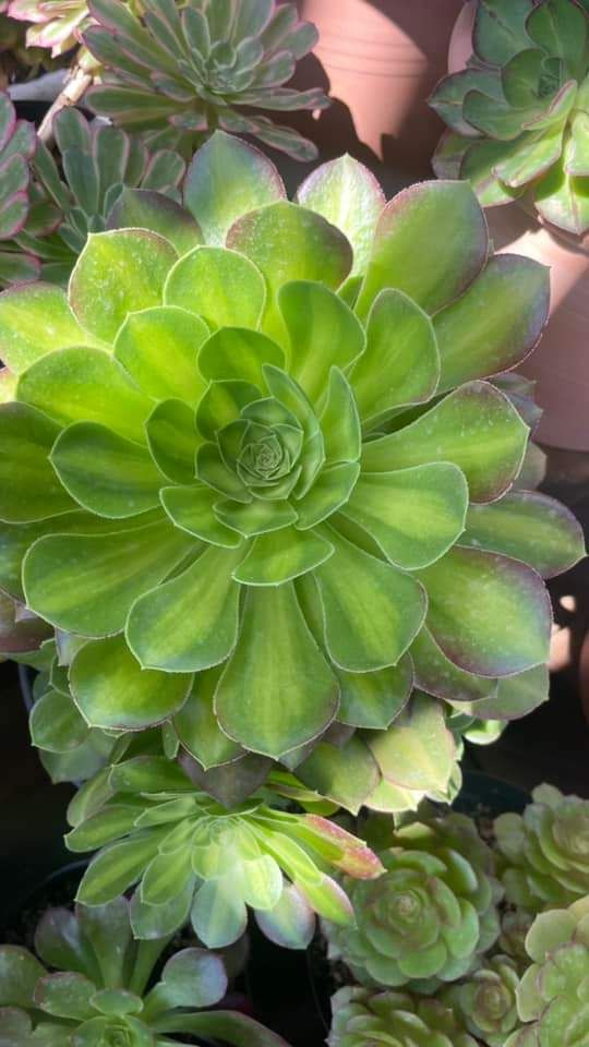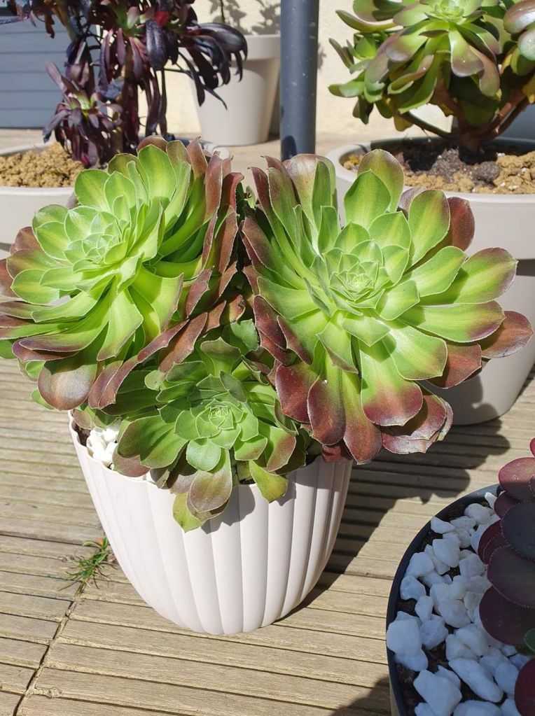 Plus la luminosité va augmenter, plus les anciennes feuilles vont avoir tendance à foncer et prendre des teintes rouge bordeaux sur tout ou partie de la feuille en commençant par les pointes des feuilles. Le cœur de pousse restera lui toujours vert et vert pâle. Cet Aeonium n’évolue que peu au fil des saisons.