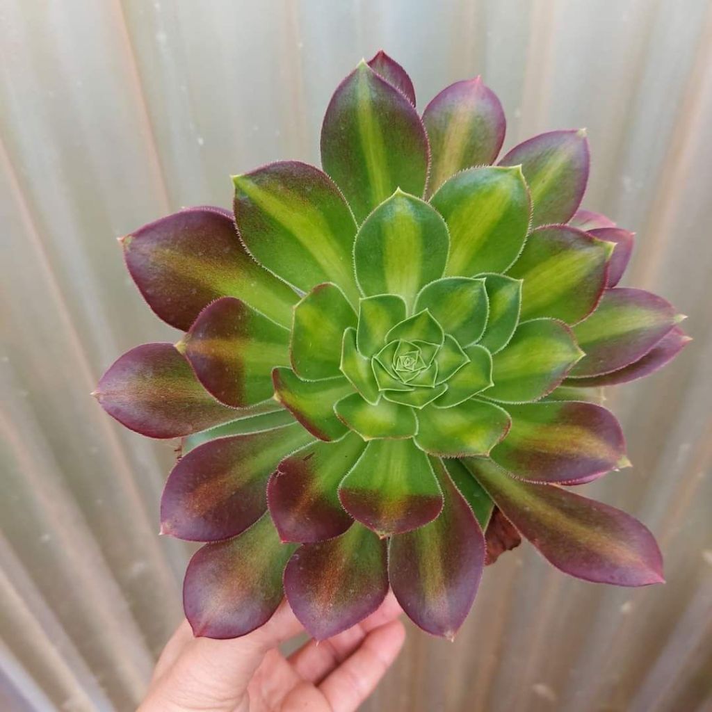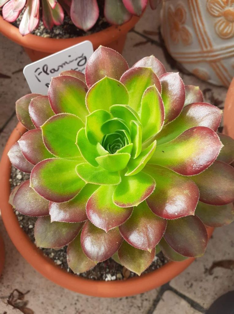 DESCRIPTION : L’Aeonium ‘Flaming Mountain’ est un Aeonium variegata issu de l’Aeonium ‘Pink Witch Yellow Middle’.