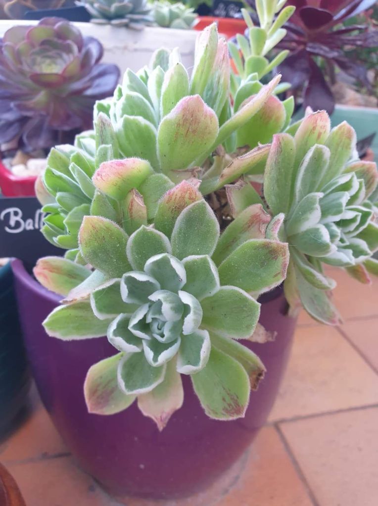 DESCRIPTION : L’Aeonium ‘Ballerina’ est un Aeonium variegata issu de l’Aeonium x globosum.