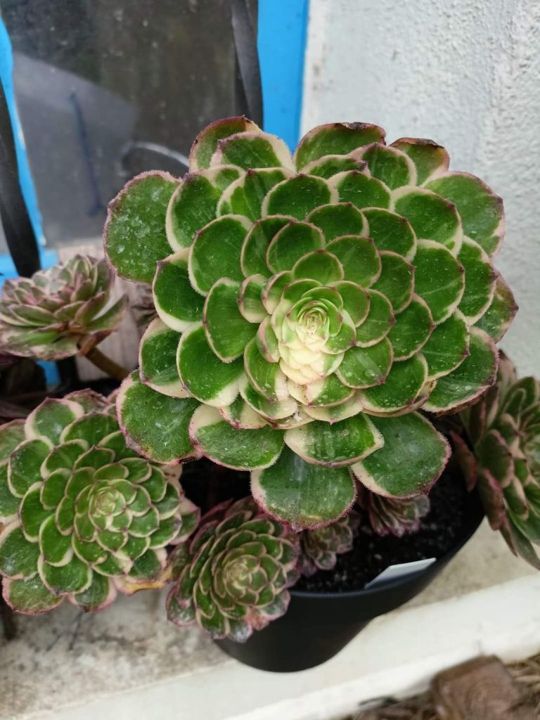 Cet Aeonium variegata a une pousse plutôt rapide et rejette normalement. Pas de fragilité particulière relevée à ce stade (à surveiller tout de même car la plupart des Halloween variegata sont assez fragiles).