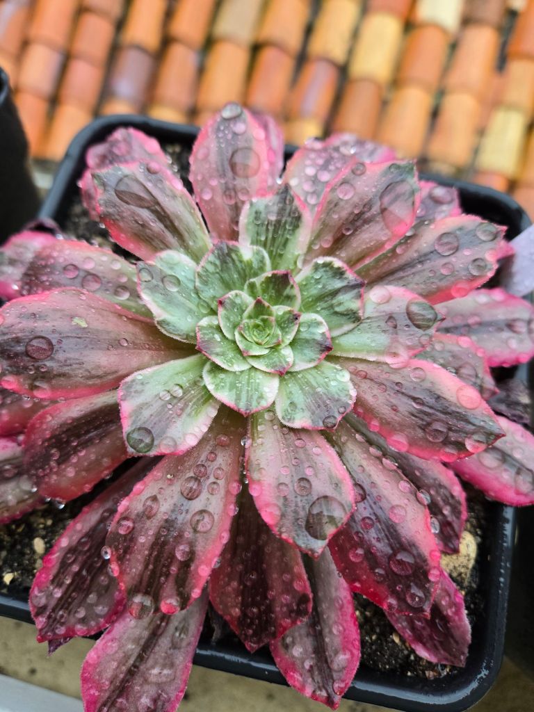 En plein hiver lorsque la luminosité est faible, son feuillage est constitué d’une bande centrale verte striée de marbrures et de bandes latérales couleur blanc/crème qui se teintent d’une couleur rose/rouge plus l’exposition est lumineuse. Cette teinte rose/rouge apparaît d’abord sur les bordures hautes de la feuille puis descend petit à petit. Plus la luminosité et les températures vont monter, plus cette teinte rose/rouge va prendre le dessus et venir colorer une grande partie de la feuille. Il est très facile à confondre avec l’Aeonium ‘Wedding Dress’.