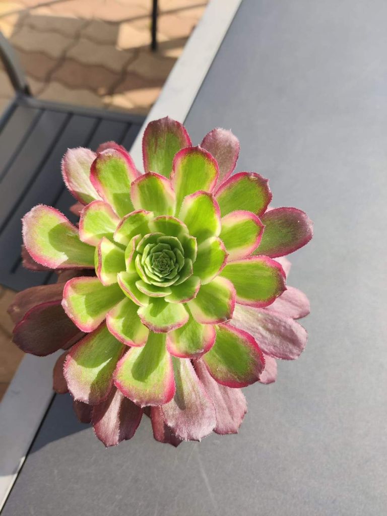 Plus la luminosité va augmenter, plus la feuille va se teinter de rouge sur les bordures et c’est vraiment SA marque de fabrique qui permet de le reconnaitre et de se démarquer des autres Aeonium car il va avoir tendance à rester comme ça même au plus fort de l’été alors que les autres Aeonium de ce type ont tendance à voir la bande centrale foncer et noircir beaucoup plus facilement.