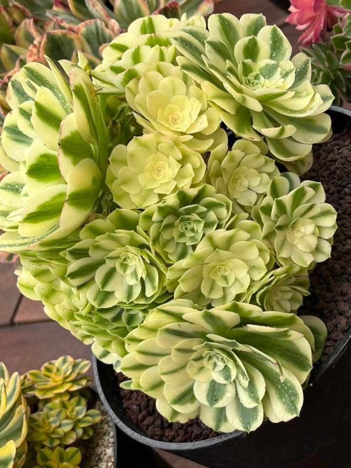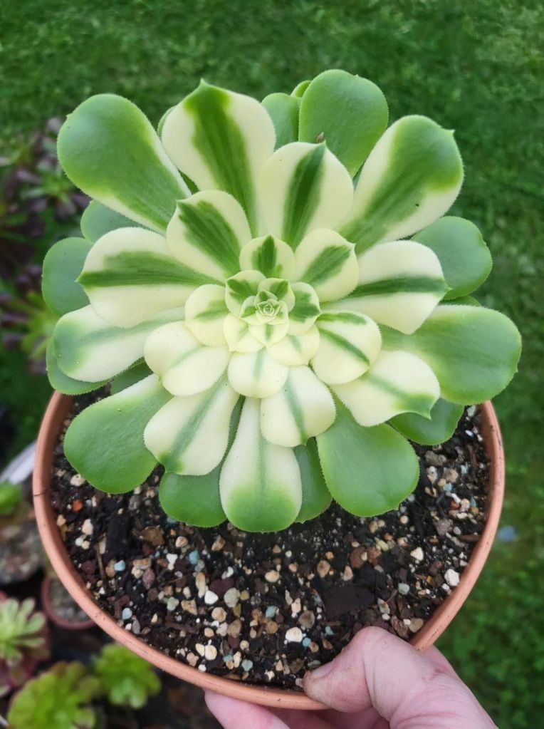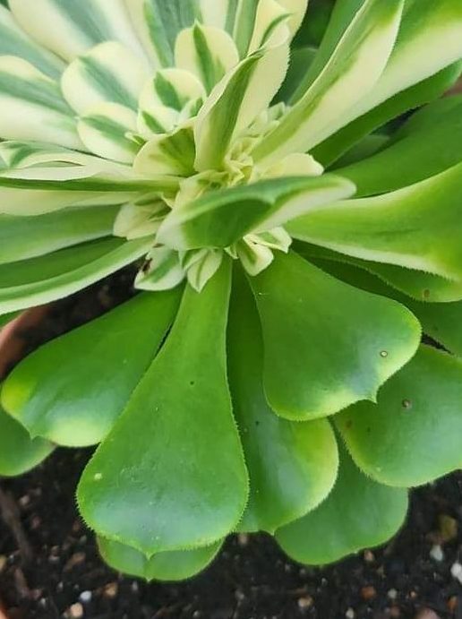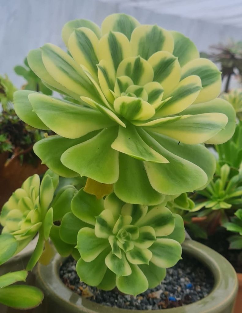 DESCRIPTION : L’Aeonium ‘Sinya’ est un Aeonium ‘variegata dont l’origine est encore inconnue mais il serait à priori probablement une variation de l’Aeonium ‘Maybach’.