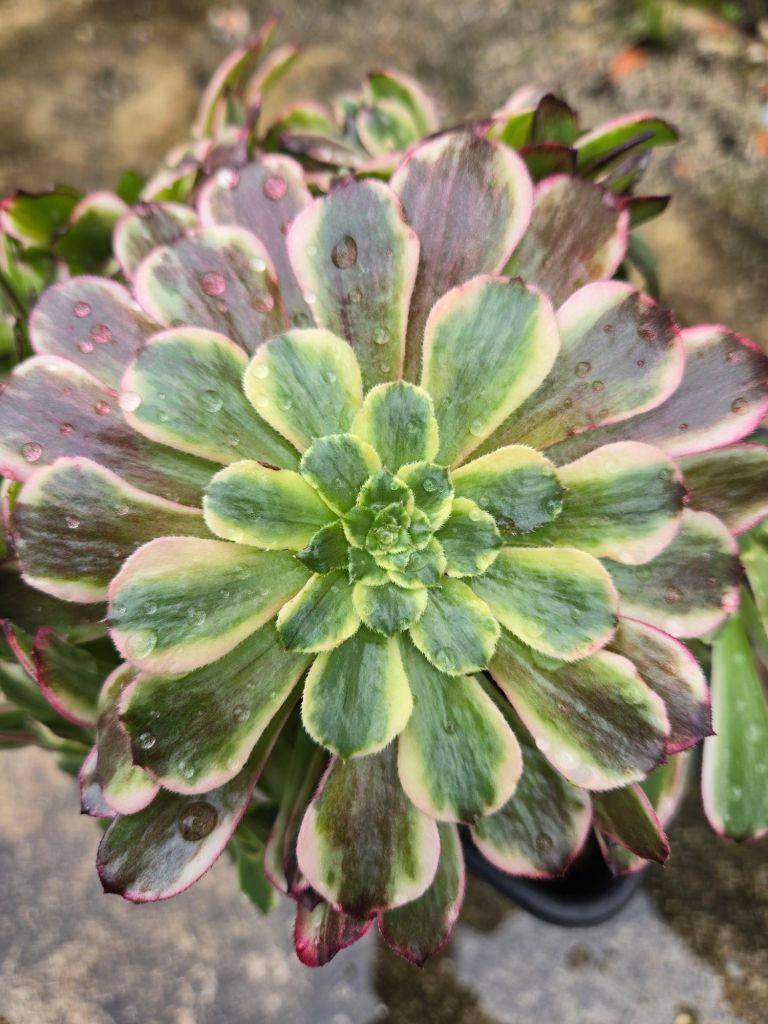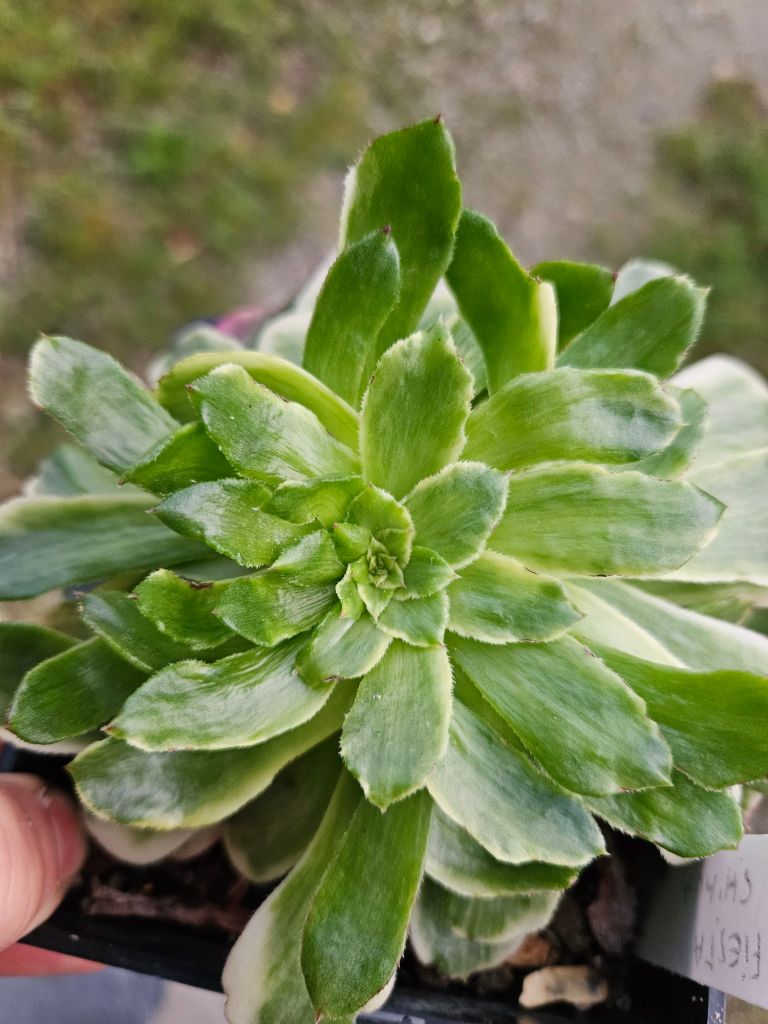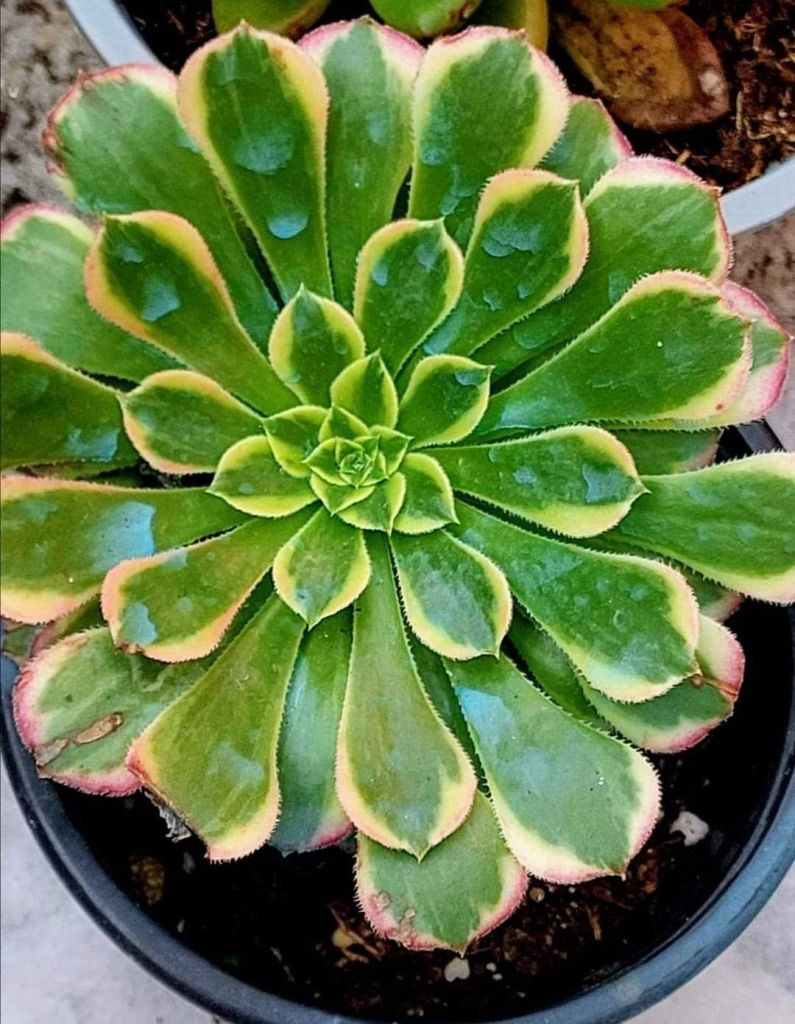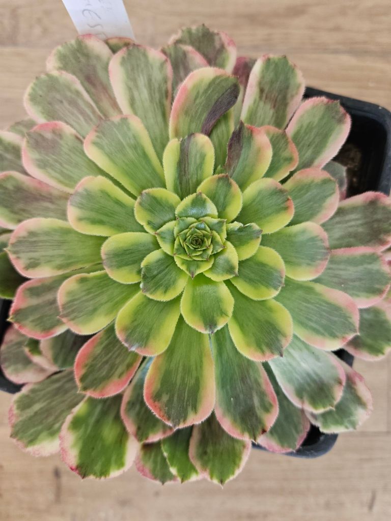 DESCRIPTION : L’Aeonium ‘Shihua Fiesta’ est un Aeonium variegata issu de la mutation de l’Aeonium ‘Fiesta’. C’est une variation très rare et difficile à trouver.