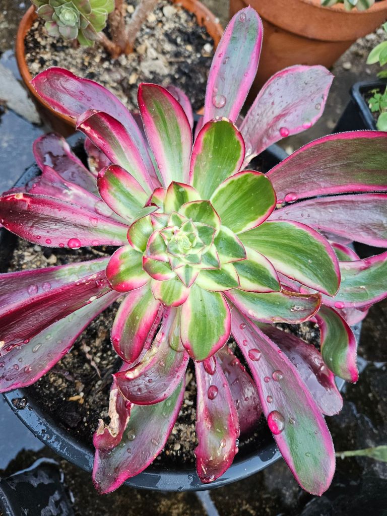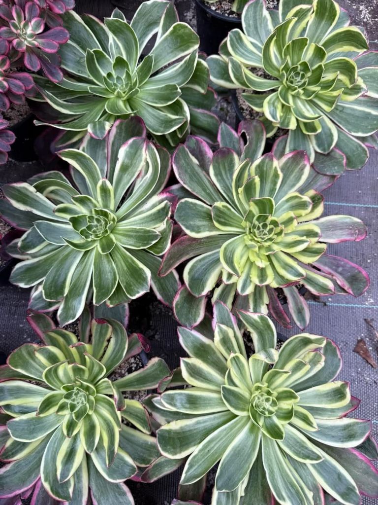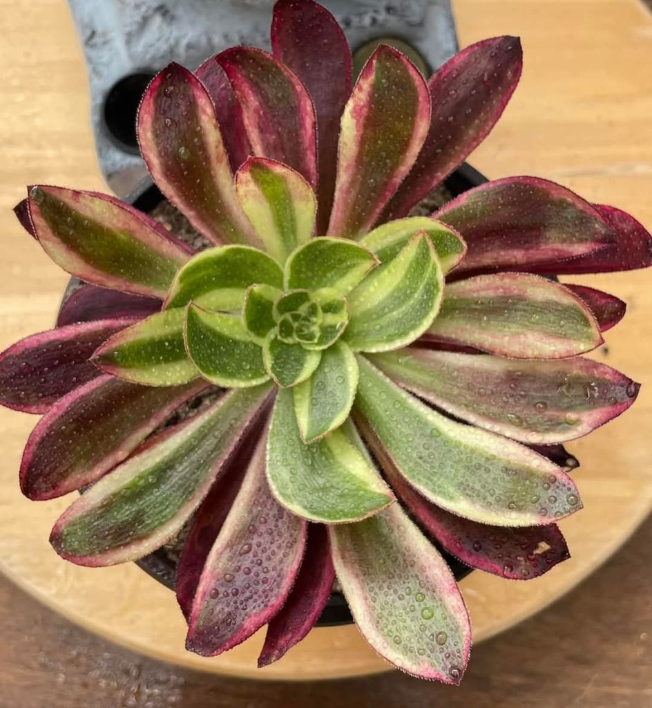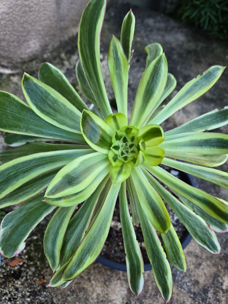 Avec l’augmentation de la luminosité, des températures et du stress hydrique, les feuilles périphériques peuvent foncer et rosir mais cette coloration ne vient pas aussi facilement que chez d’autres Aeonium variegata car il a tendance à vouloir rester vert le plus longtemps possible.