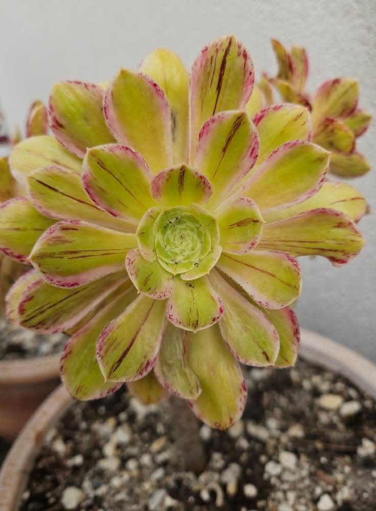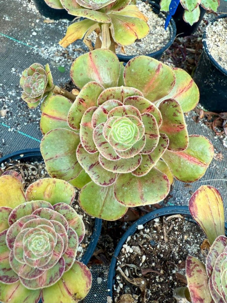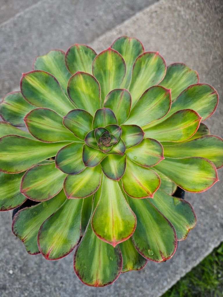 Il a tendance à perdre momentanément sa variegation en été mais il se teinte de magnifiques couleurs caractéristique de son parent l’Aeonium rubrolineatum ce qui n’est pas absolument pas dérangeant.