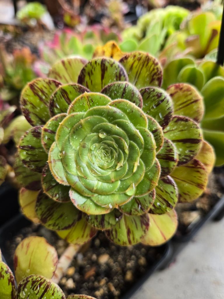 En plein hiver lorsque la luminosité est faible, son feuillage est constitué d’une bande centrale jaune et de bandes latérales couleur vertes. Plus la luminosité va augmenter, plus des stries rouge bordeaux/ violet foncé en forme de stries vont apparaître sur les feuilles ce qui est une des caractéristiques de cet Aeonium.