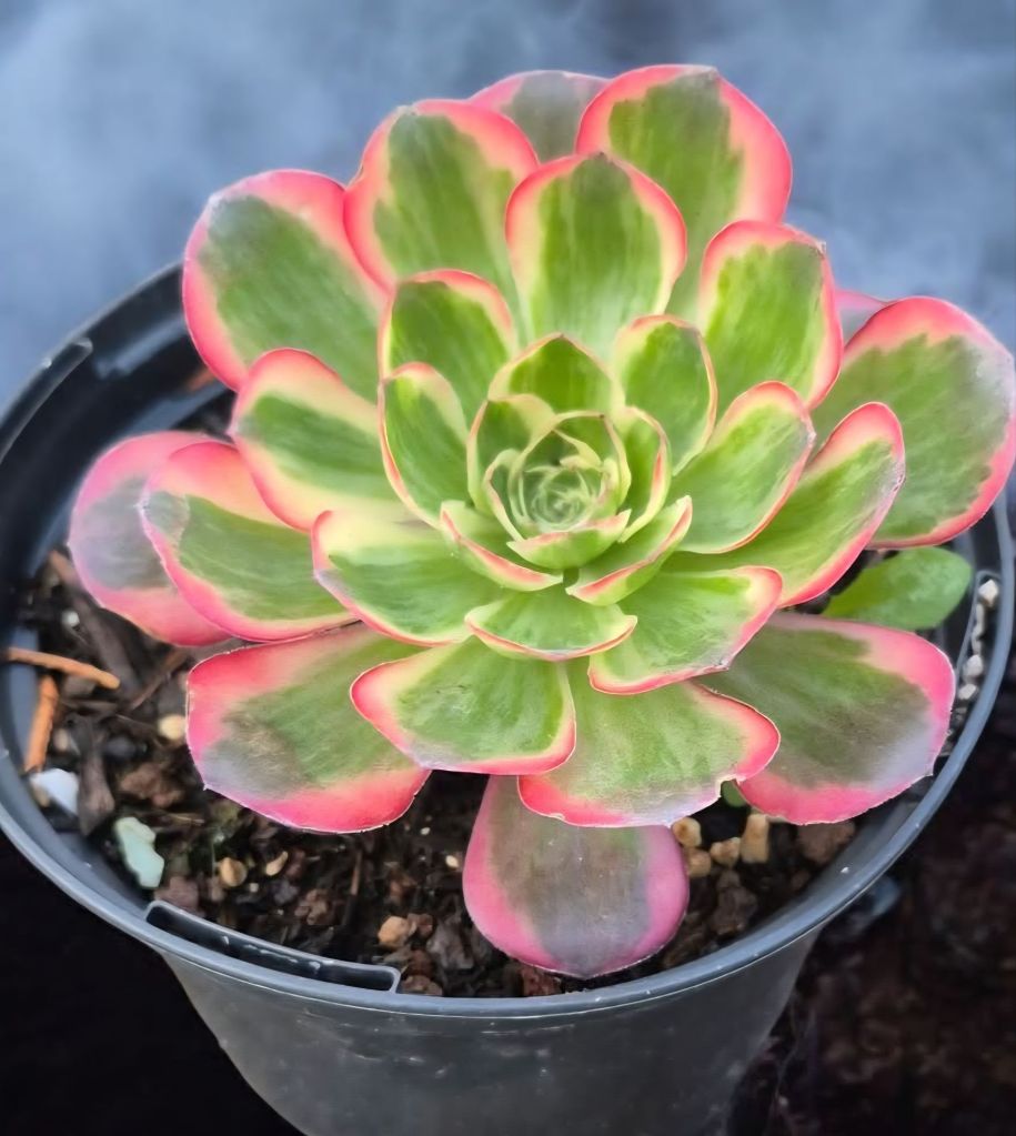 DESCRIPTION : L’Aeonium ‘Charm Golden Rose variegata’ est un Aeonium variegata issu de l’Aeonium ‘Charm Golden Rose’. Le premier Aeonium variegata de cet hybride peu répandu. Un peu de fraîcheur dans l’univers des Aeonium variegata !