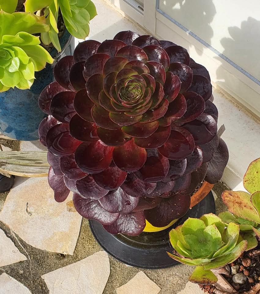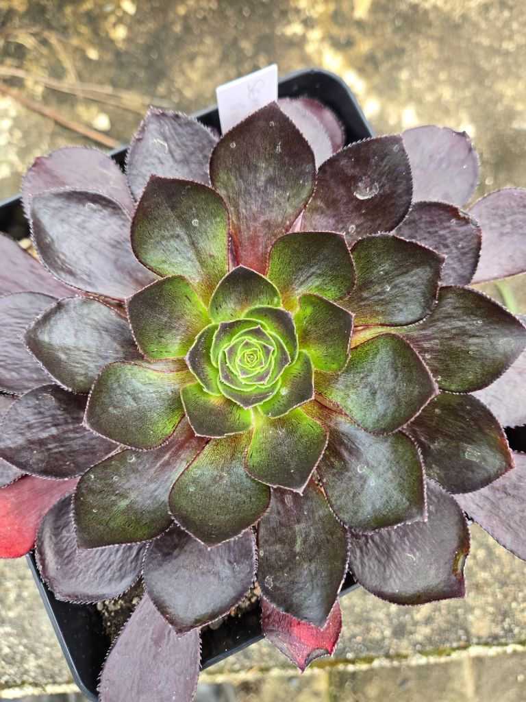 Sortie commercialement en 2022, Ce x Semponium a des feuilles foncées et veinées très particulières qui en font une variété vraiment belle et intéressante. Plutôt vert en hiver, ses couleurs vont prendre des teintes violet voire noires sous un fort ensoleillement. Une caractéristique intéressante de cette variété est sa capacité à conserver des couleurs sombres une bonne partie de l’année.