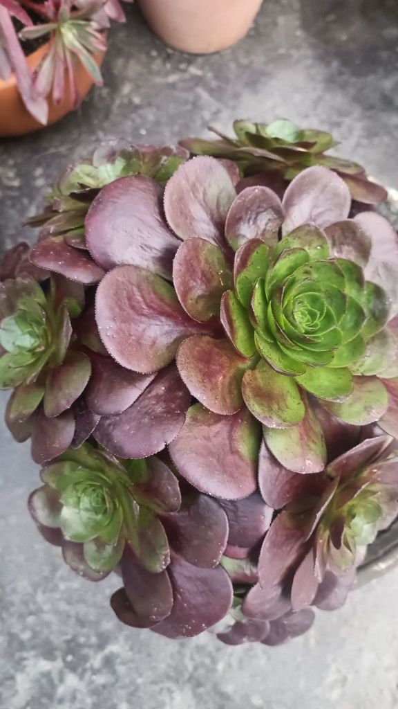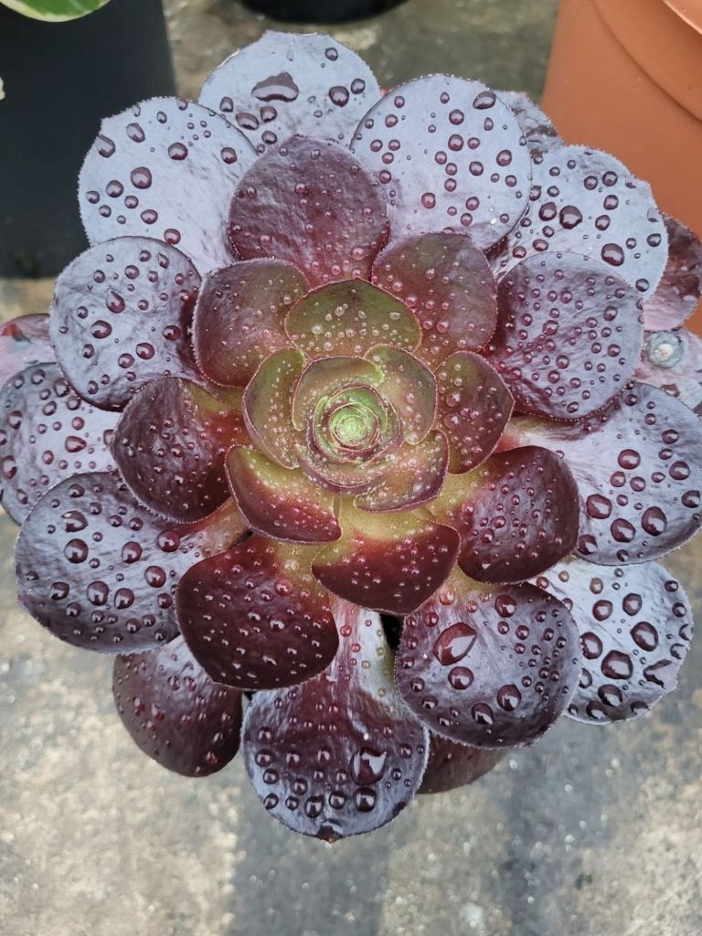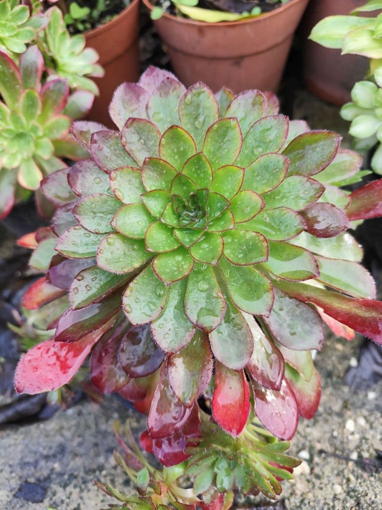 ‘Darwin’ a une forme compacte et des teintes rouge bordeaux. D’après Daniel Michael, cette teinte foncée a été introduite par le Sempervivum ‘Pink Puff’, ce qui serait la première fois qu’une coloration rouge est introduite dans un Aeonium sans utiliser ‘Schwarzkopf’.