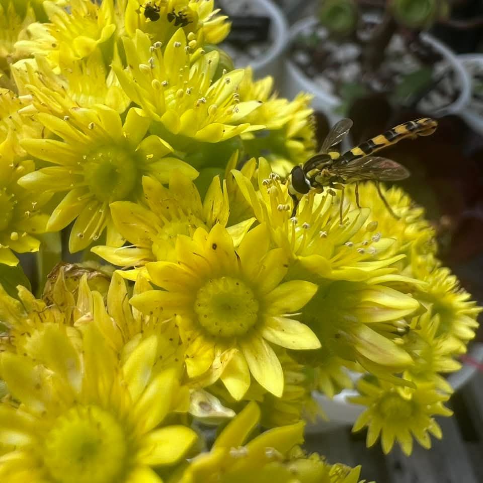 Durant l’été, Daniel a prélevé du pollen frais sur l’Aeonium ‘Ice Warrior’ et l’a délicatement transféré sur le Sempervivum ‘Green Ice’, fraîchement fleuri, à l’aide d’un pinceau doux et d’une pince à épiler.