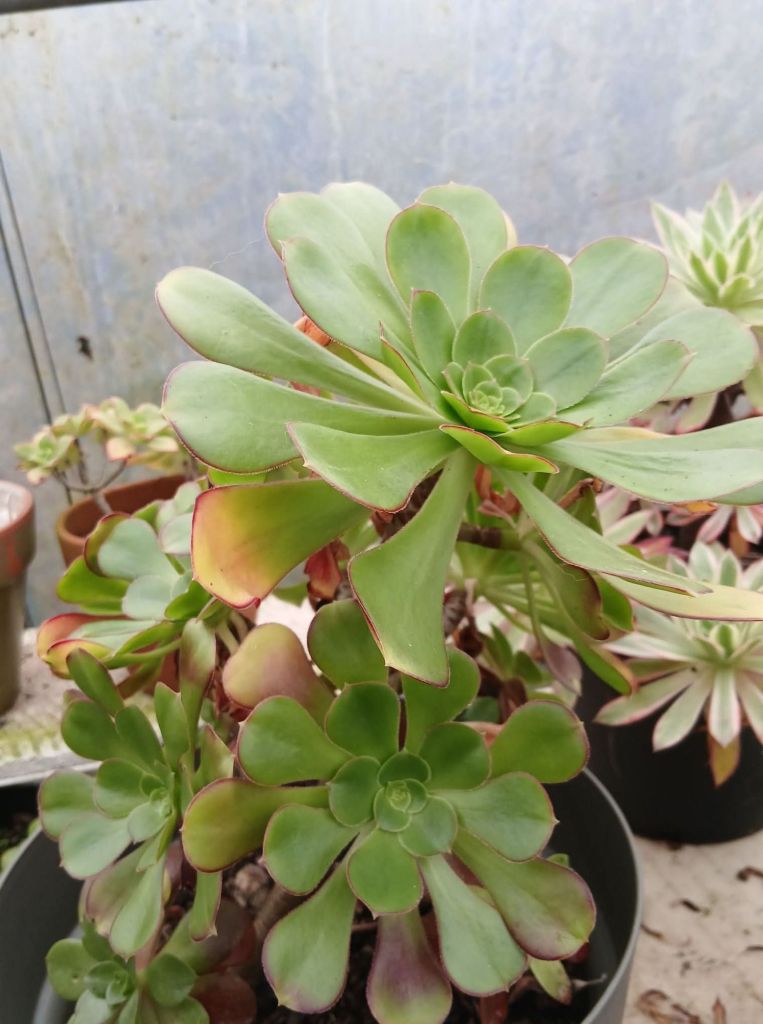 L’Aeonium ‘Jack Catlin’ est issu d’une hybridation entre les Aeonium tabuliforme et le fameux Aeonium ‘Zwartkop’. Des trois clones obtenus par ce croisement, c’est celui qui a été le préféré même s’il ne correspondait pas aux critères recherchés par cette hybridation. Il s’est avéré très vigoureux. Ses rosettes peuvent atteindre 20cm de diamètre et sont plus grandes que celles de A. arboreum ‘Zwartkop’ et plus en coupe que celles de A. tabuliforme. Ses rosettes sont d’un vert brillant au centre et rouge aux extrémités. Bonne tolérance aux chaleurs estivales. Il peut atteindre une hauteur d’environ 40-50 cm.