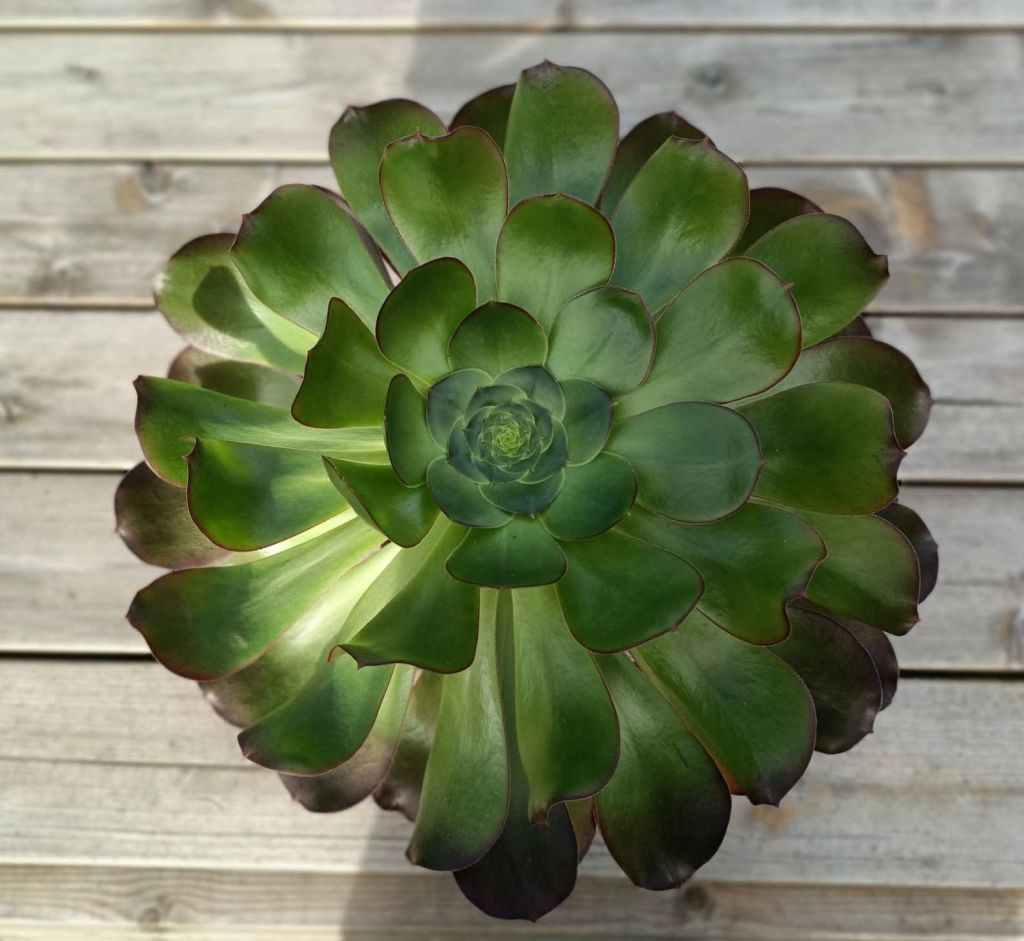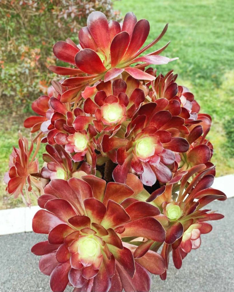 L’Aeonium ‘Cyclops’ est lui aussi tout comme son frère l’Aeonium ‘Voodoo’ issu de l’hybridation entre l’Aeonium undulatum et l’Aeonium ‘Zwartkop’. Cyclops comme Voodoo est une très grande variété et peut attendre 1.50m de haut. Sa rosette est très large et peut atteindre 35/40cm, elle est de couleur foncé en été (brun rouge foncé) mais le cœur a tendance à rester vert ce qui est à l’origine de son nom.