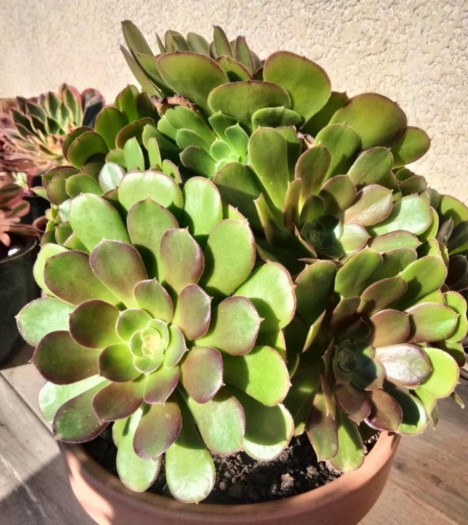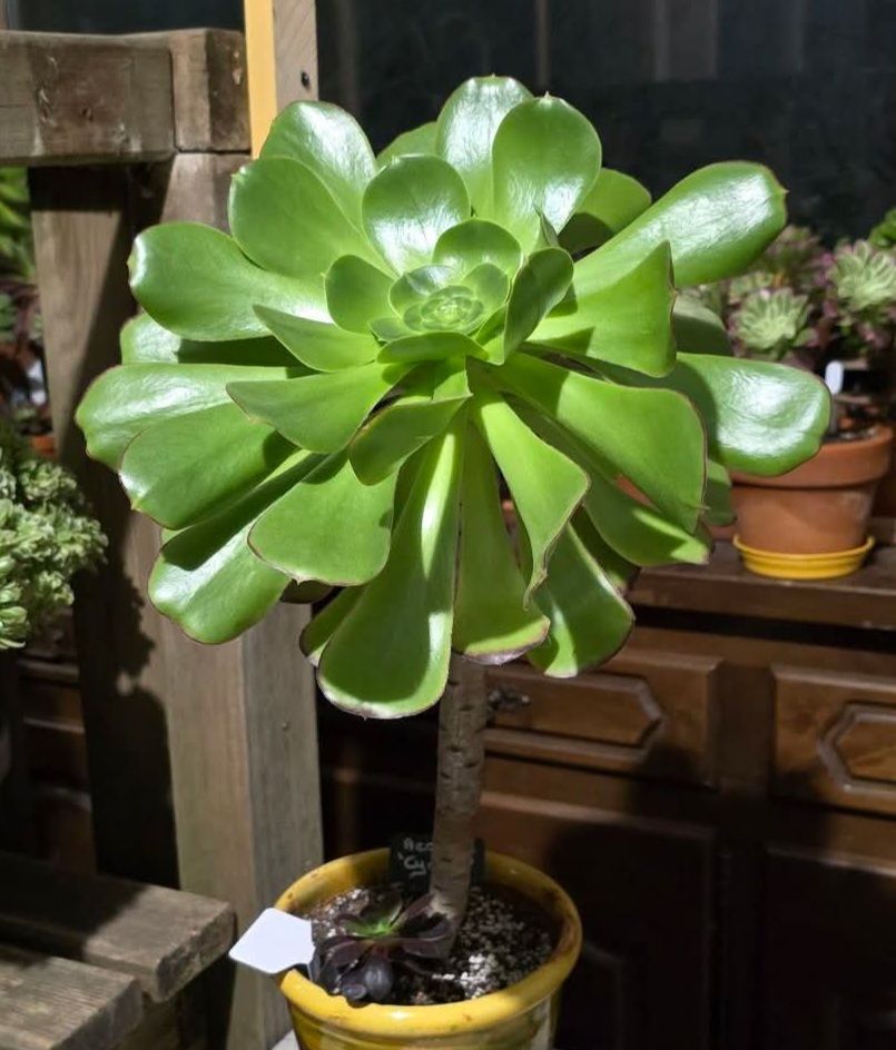 Il est le fruit tout comme ‘Velour’ du mariage de l’Aeonium ‘Zwartkop’ et de l’Aeonium canariense. Ce magnifique Aeonium présente des groupes serrés de rosettes de feuilles vertes légèrement velues teintées de rouge sur le dessus avec des tiges courtes et épaisses qui peuvent mesurer jusqu’à 60 cm de hauteur. Sa couleur est particulièrement vive en été et peut prendre des teintes rouge avec un bon ensoleillement et un léger stress (chaleur excessive, manque d’eau…). Ce cultivar ne fleurit pas régulièrement, mais lorsqu’il le fait, il produit de délicates fleurs jaunes.