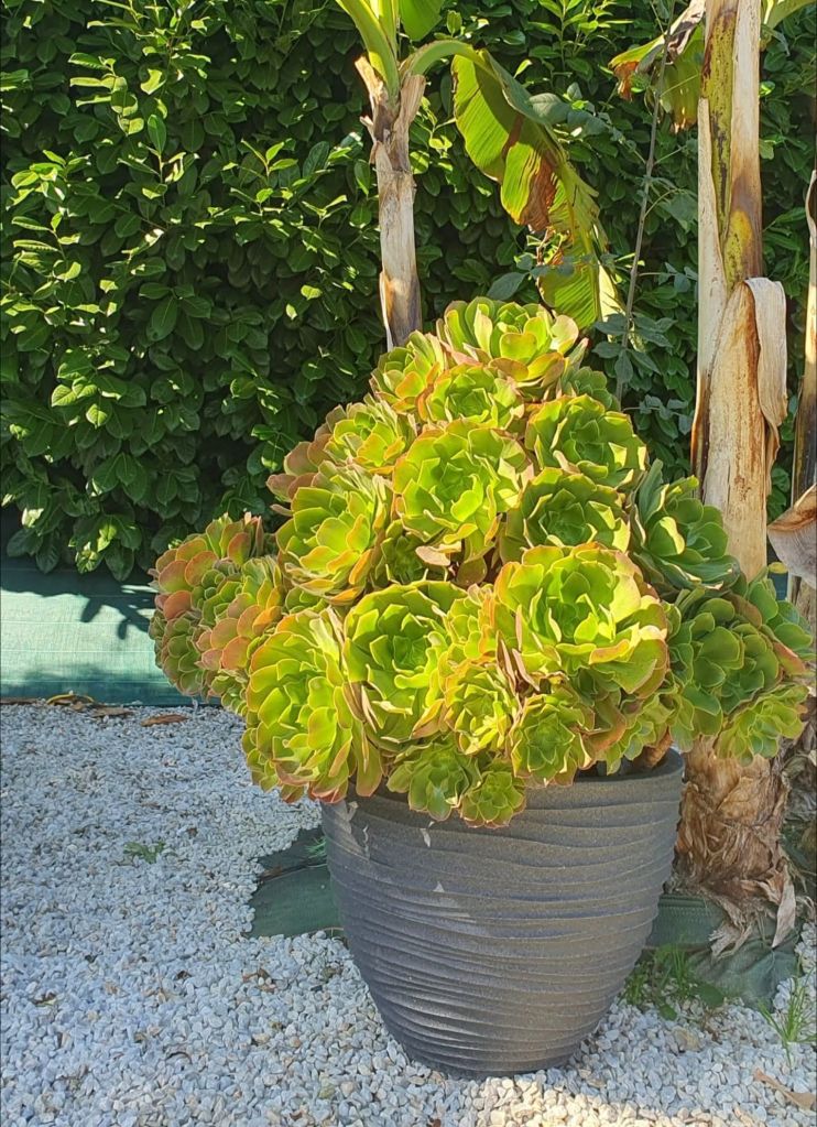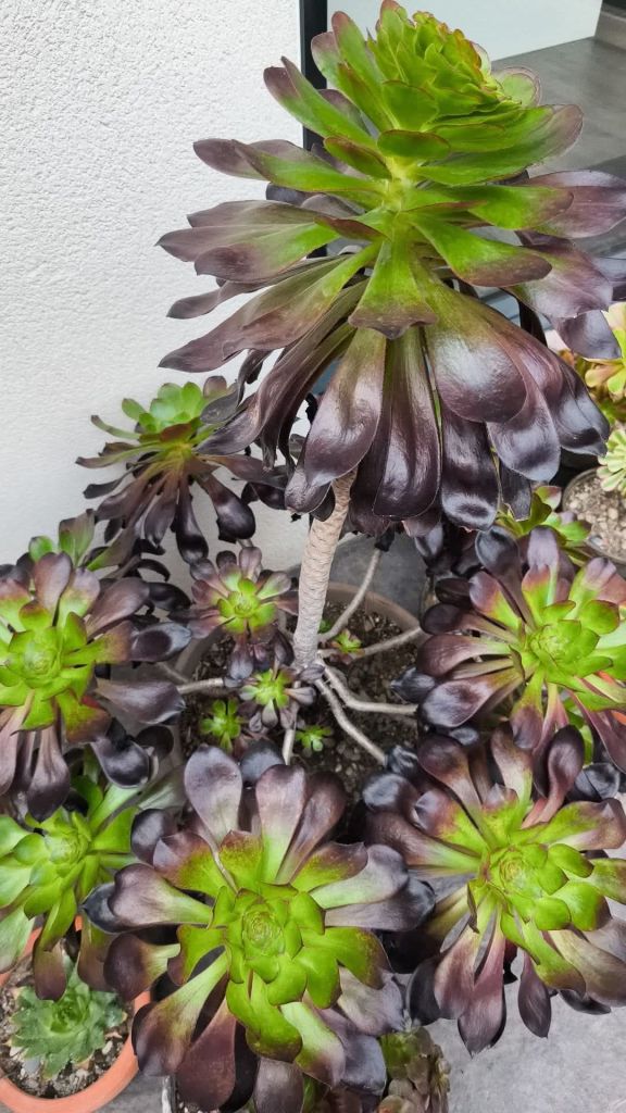 L’Aeonium ‘Voodoo’ est lui issu de l’hybridation entre l’Aeonium undulatum et l’Aeonium ‘Zwartkop’. L’Aeonium ‘Voodoo’ est un géant, il tient cette caractéristique de son parent, l’Aeonium undulatum. Il peut atteindre les 2 mètres si vous lui laissez suffisamment de place pour grandir. Il est avare en rejet et il a un port très élancé, sa rosette est très large et de couleur foncé en été (pourpre foncé voire noire) et verte en période de croissance.