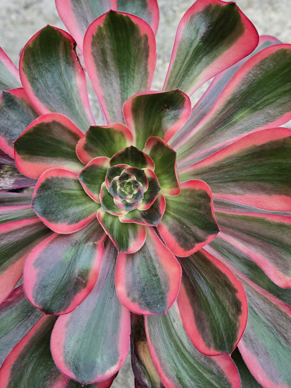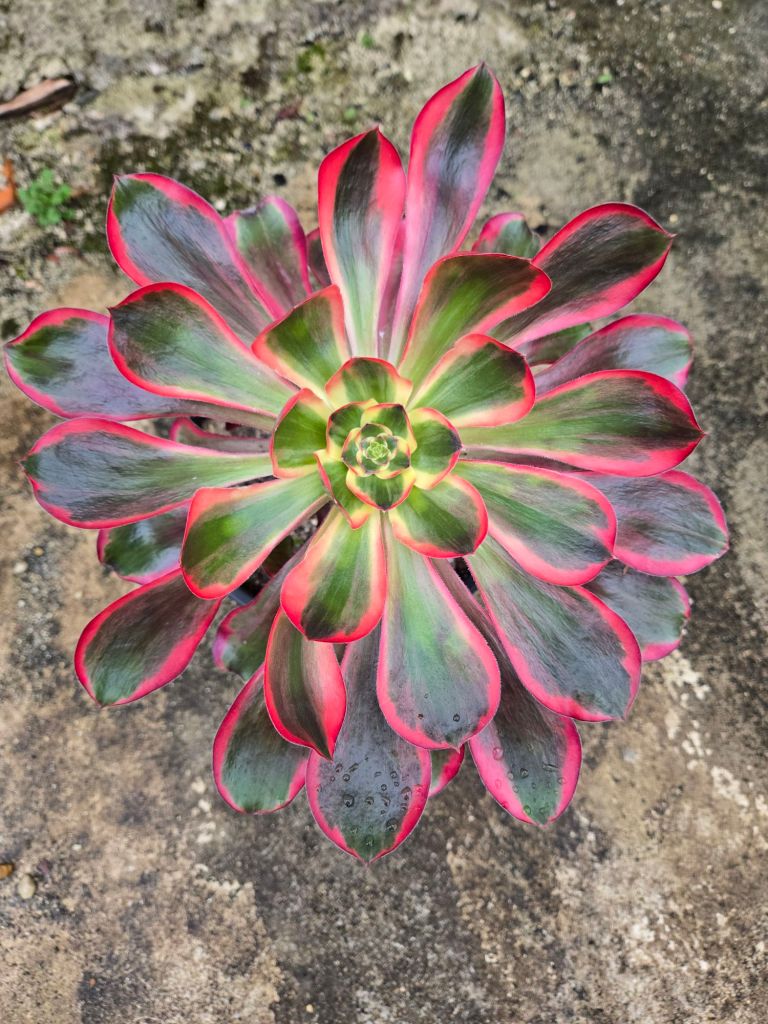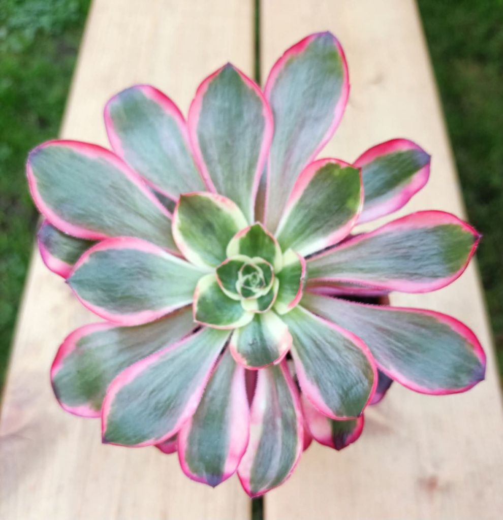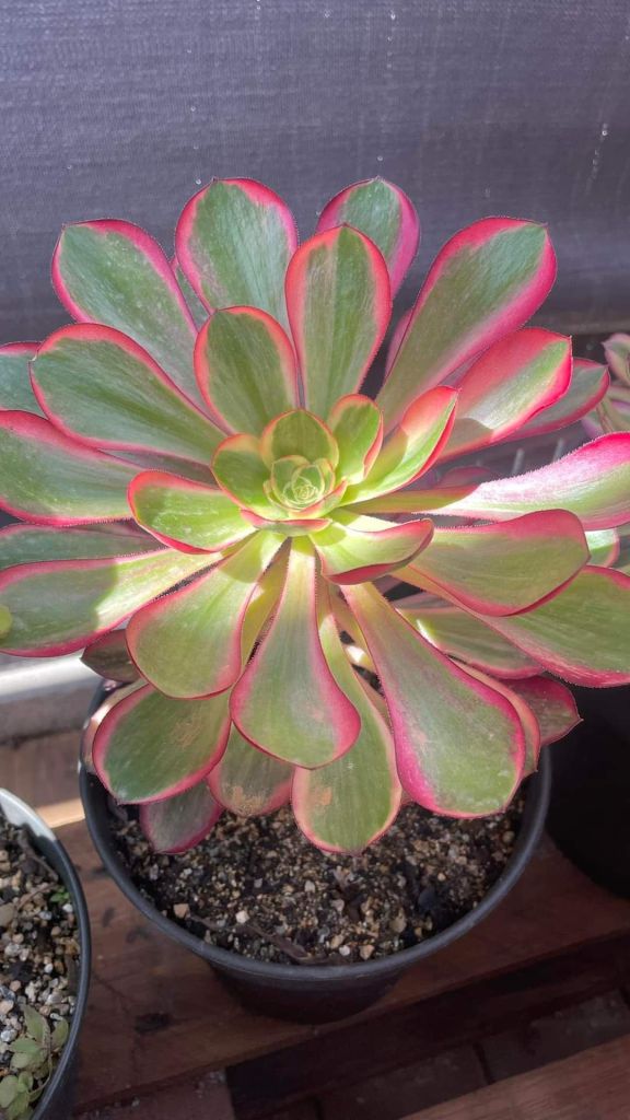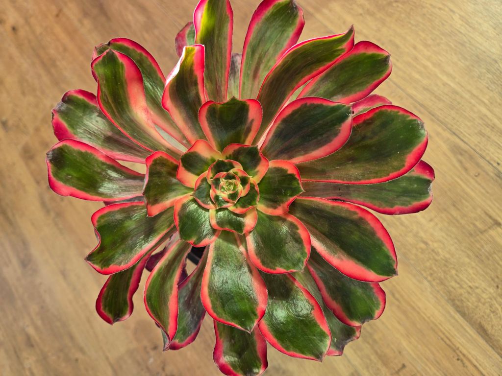 Avec l’augmentation de la luminosité, des températures et du stress hydrique, les bordures latérales rougissent. Cet Aeonium a plus de chlorophylle que le Voodoo Ultra White mais aussi des teintes rouge plus vives (voir ci-dessous).