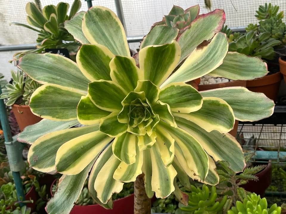 Cet Aeonium possède un tronc large et massif et devient très grand (il peut atteindre 1 mètre voire 1.5 mètres de haut) avec généralement une seule grande et large rosette qui mesure environ 35 centimètres.