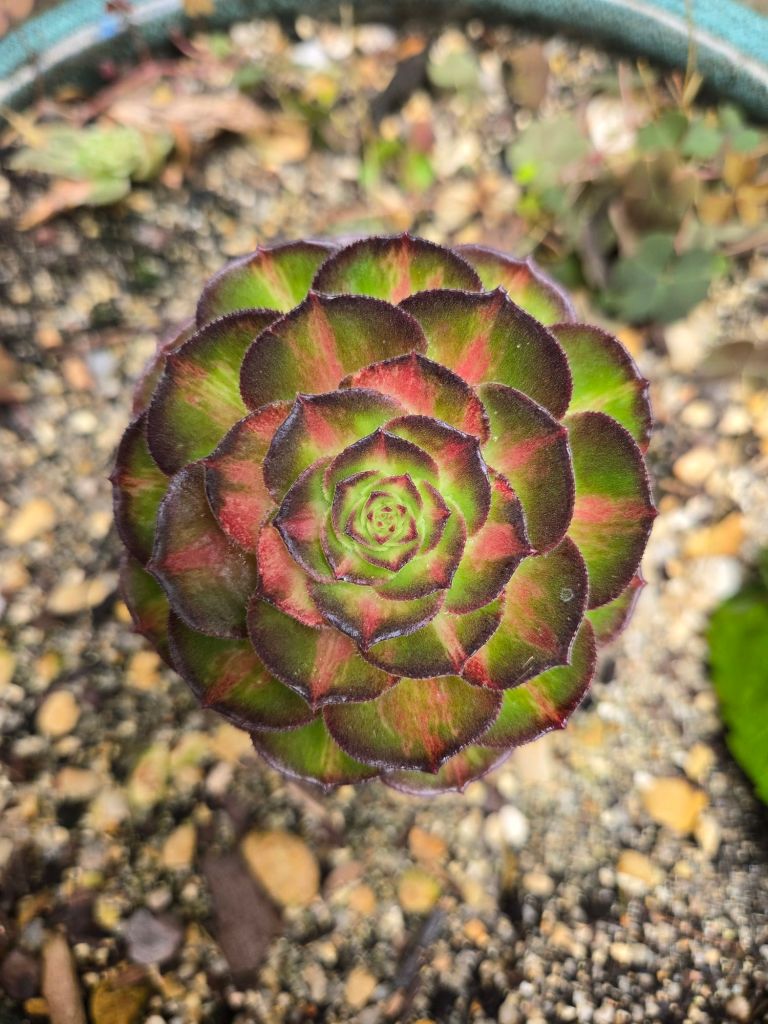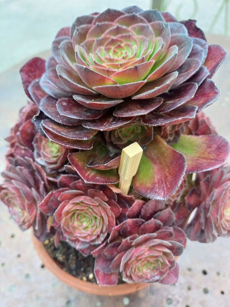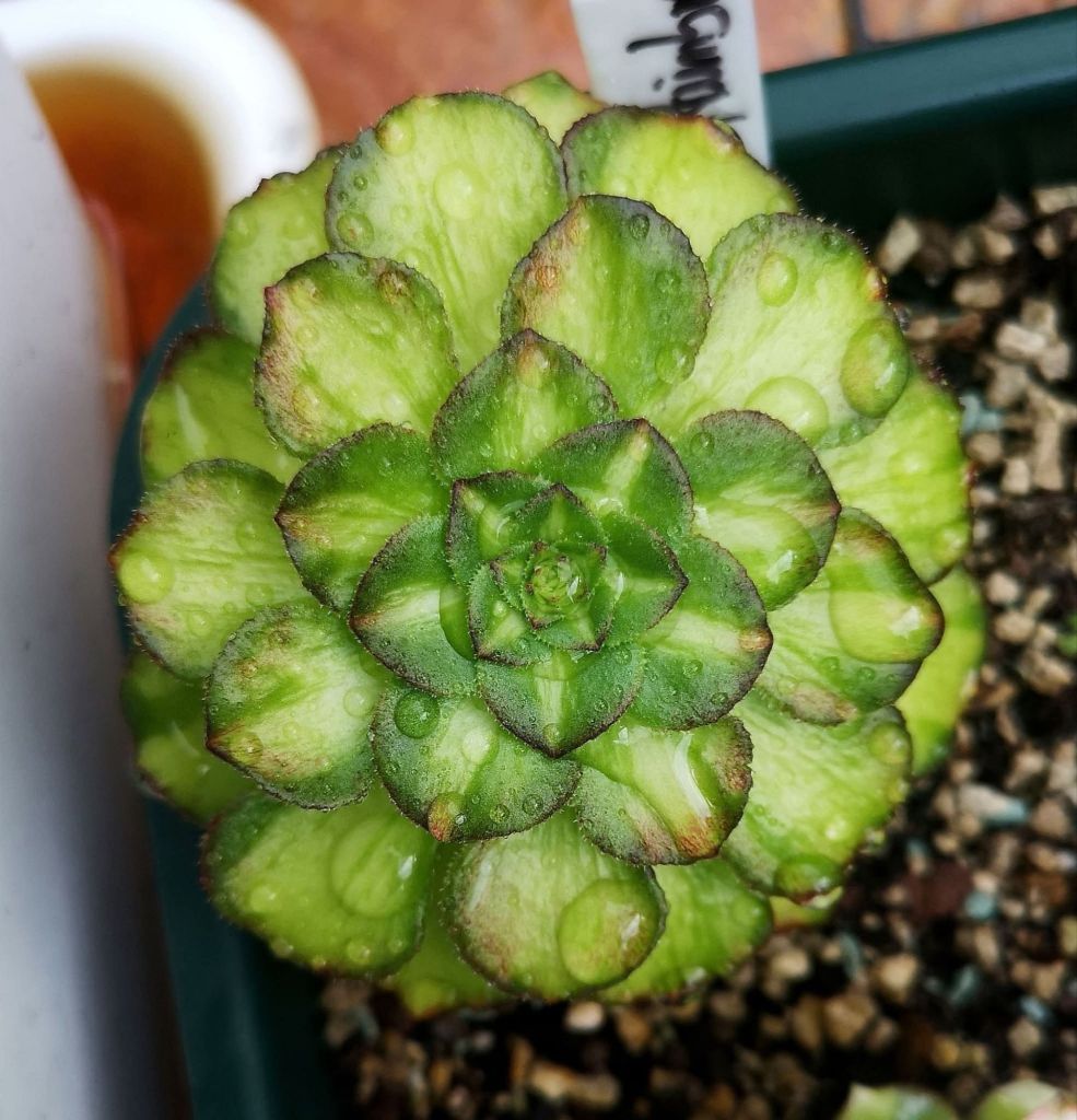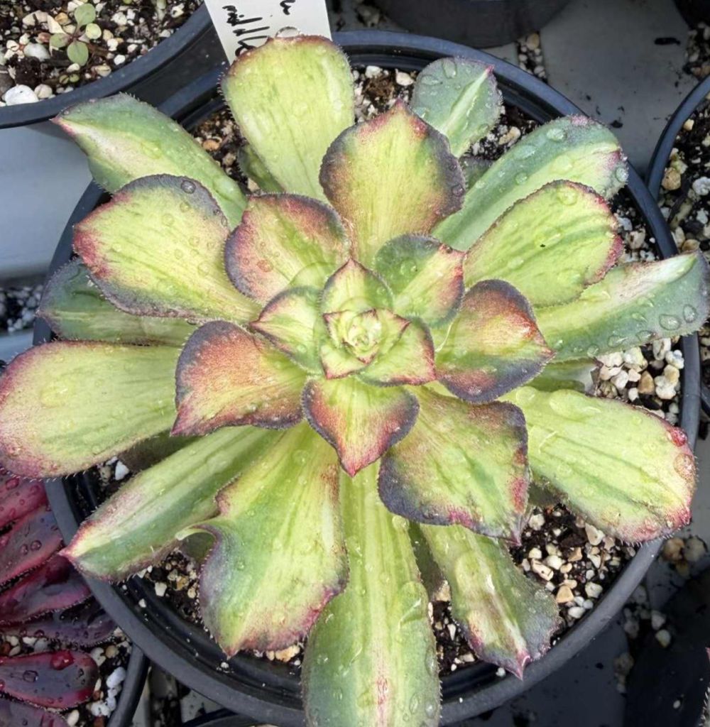 Cet Aeonium variegata a une pousse normale et rejette normalement. Certainement un peu fragile de part comme la plupart des Aeonium ‘Halloween variegata’.
