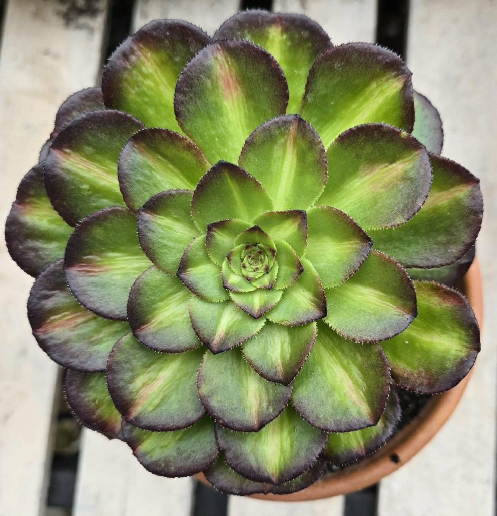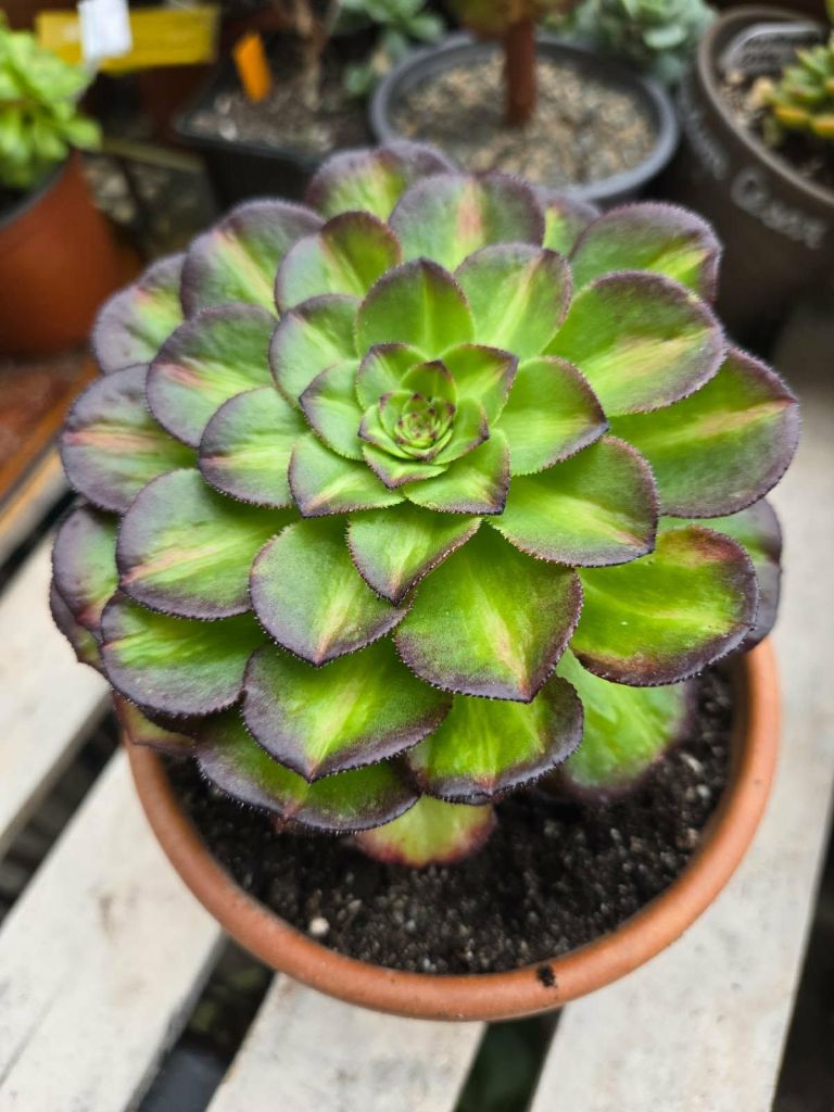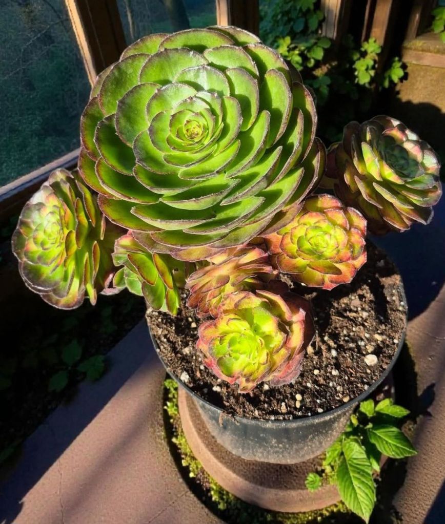 Plus la luminosité va augmenter, plus la bordure des feuilles va se teinter de mauve et la bande centrale jaune va rougir. Cet assortiment de teintes est plutôt rare dans le monde des Aeonium.