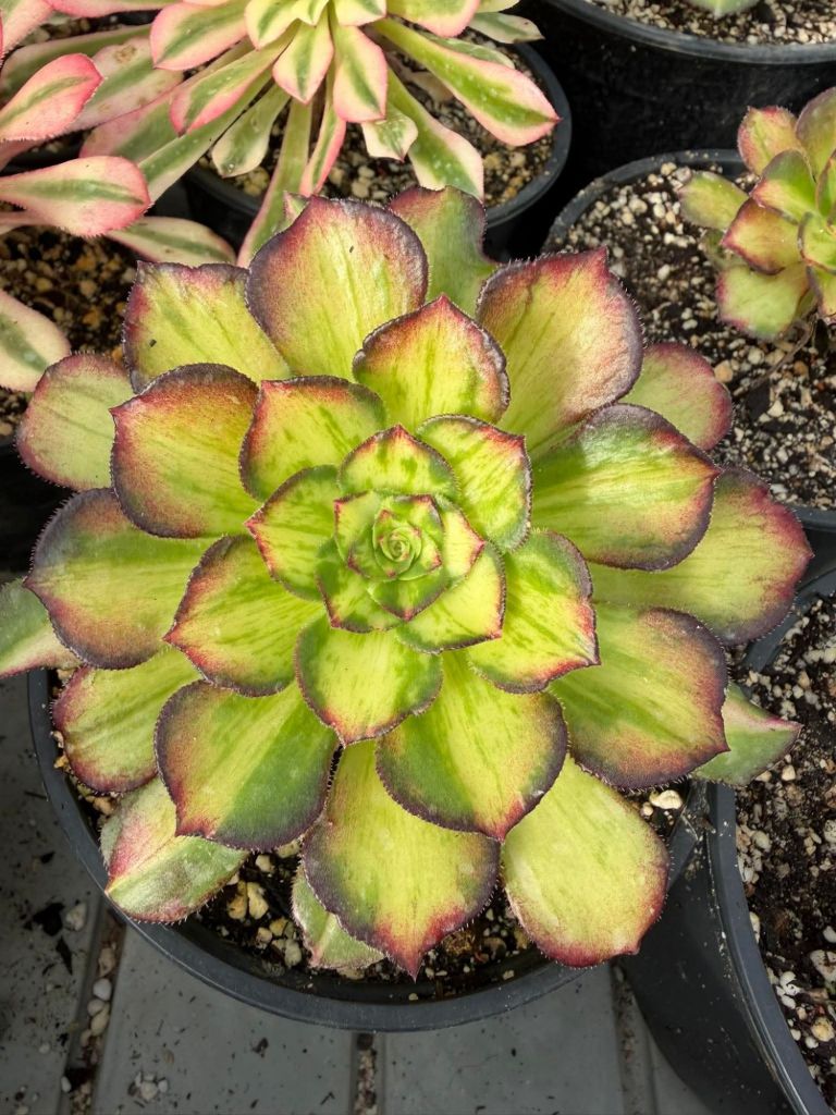 DESCRIPTION : L’Aeonium ‘Neptune Middle’ est un Aeonium variegata issu de l’Aeonium ‘Madeira Rose’ aka ‘Halloween’.