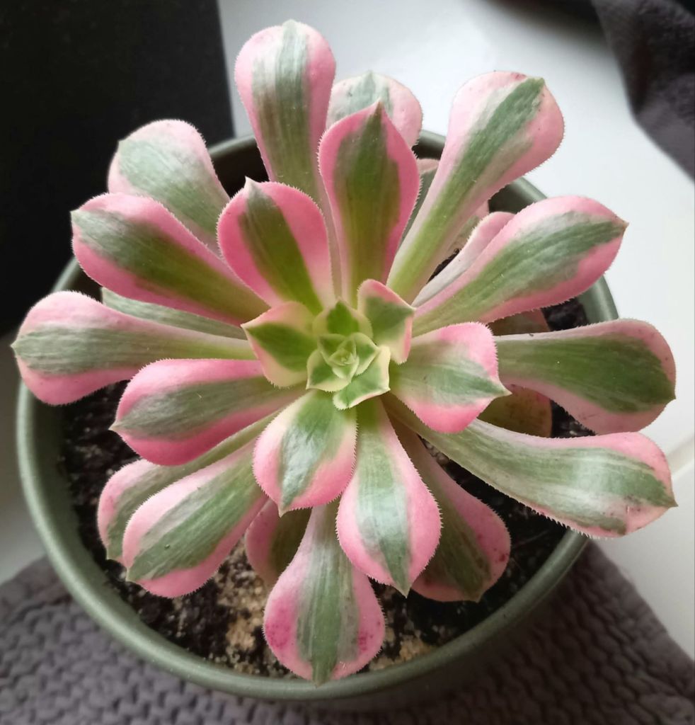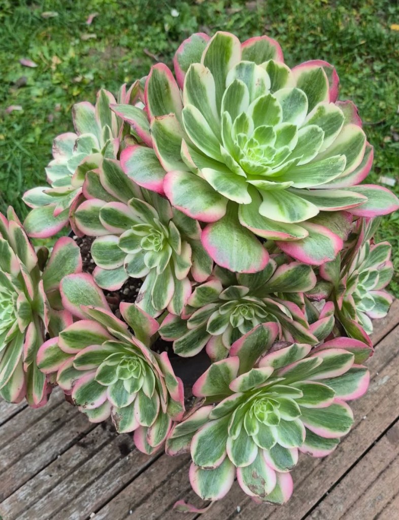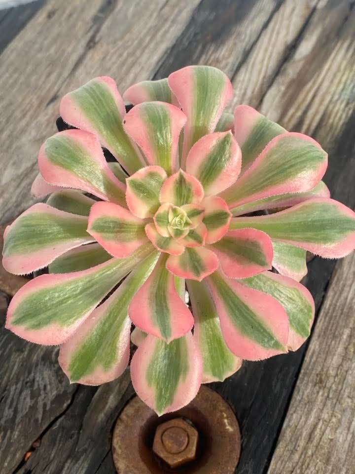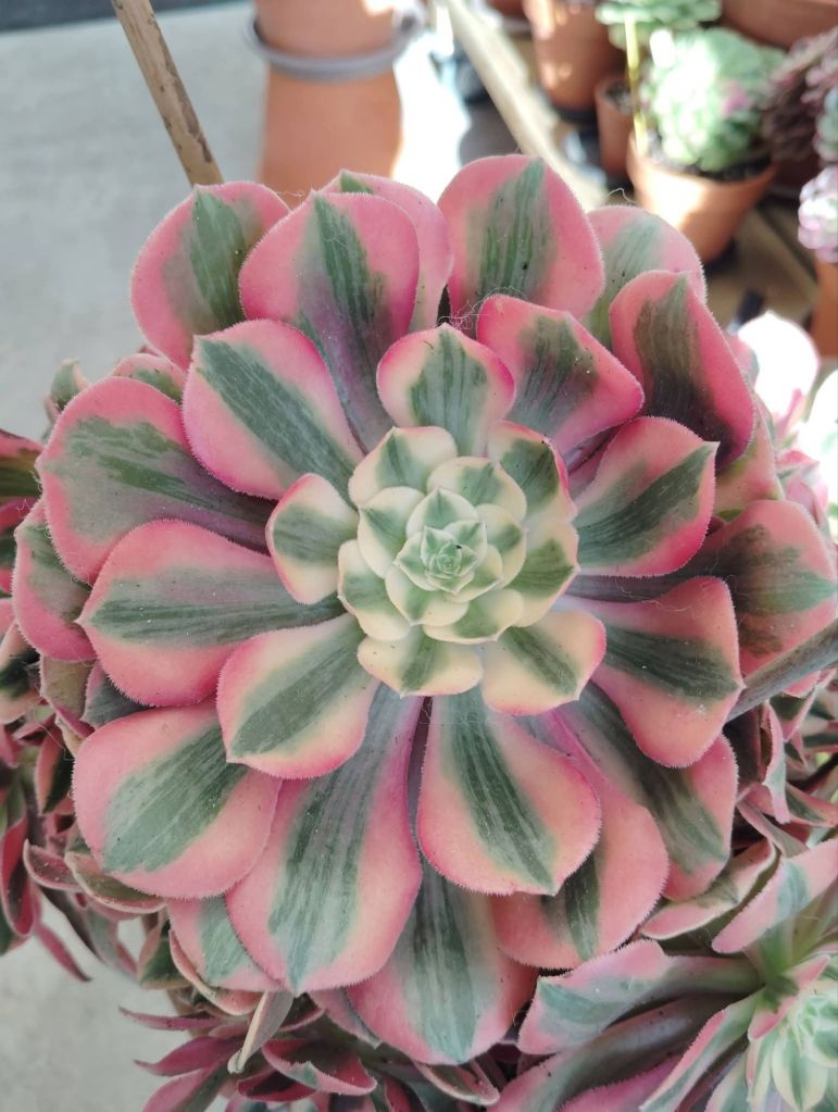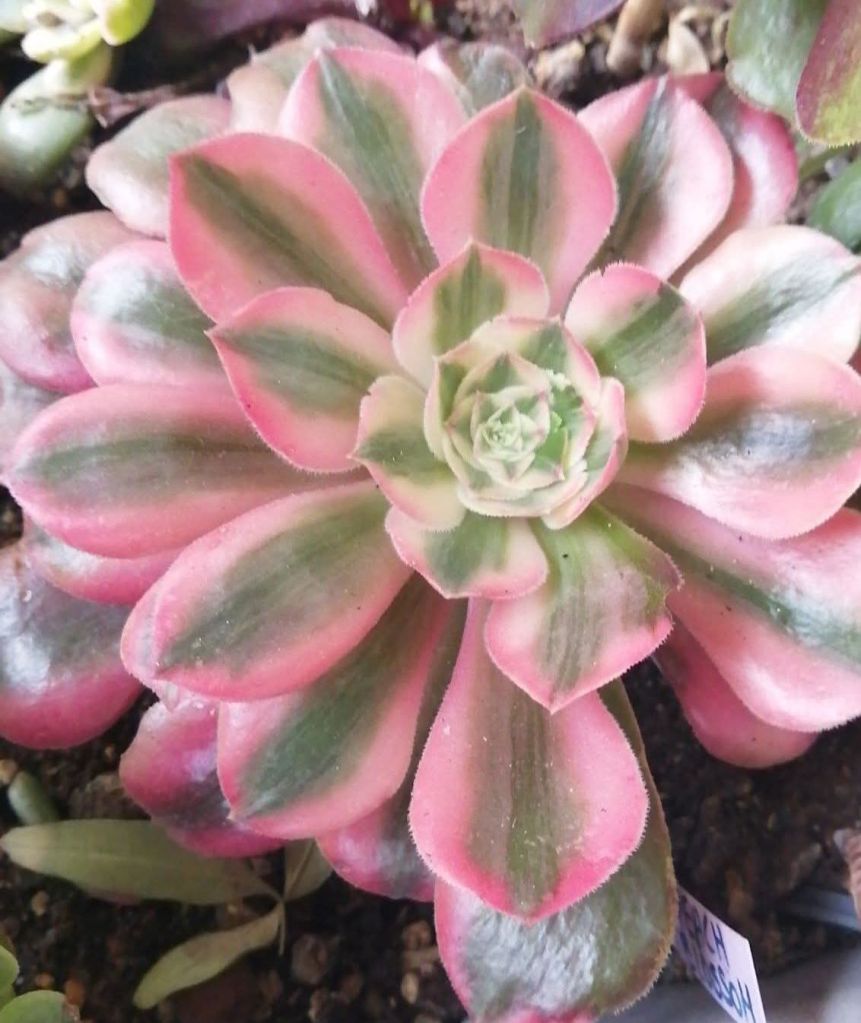 DESCRIPTION : L’Aeonium ‘Peach Blossom’ est un Aeonium variegata issu de la mutation de l’Aeonium ‘Blushing Beauty’.