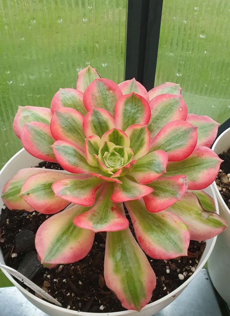 Cet Aeonium variegata semble avoir une pousse plutôt active et rejette facilement. Pas de retour sur une éventuelle fragilité mais il ne semble pas perdre facilement sa chlorophylle contrairement à d’autres Aeonium de cette famille ce qui est plutôt bon signe sur sa résistance.