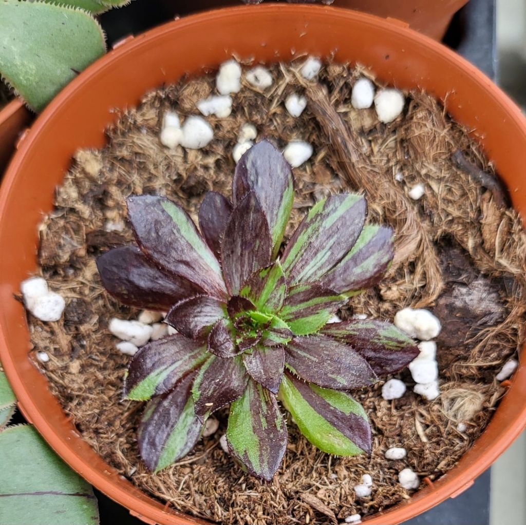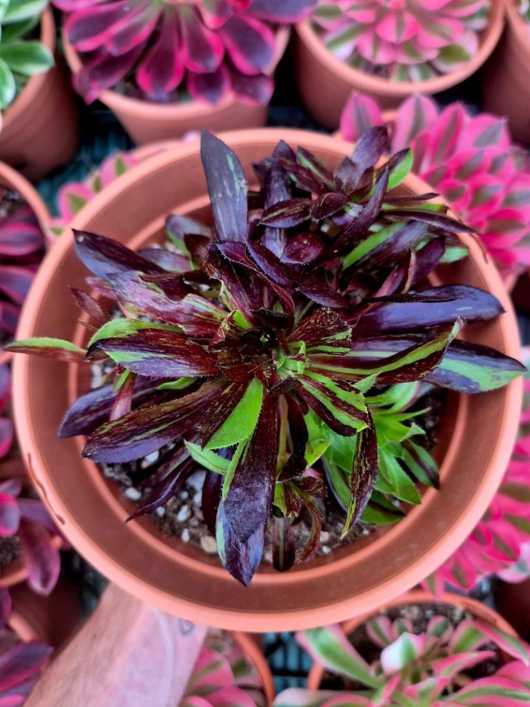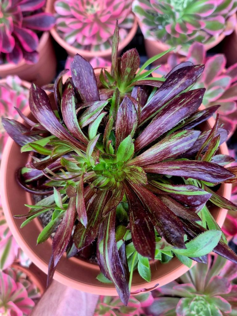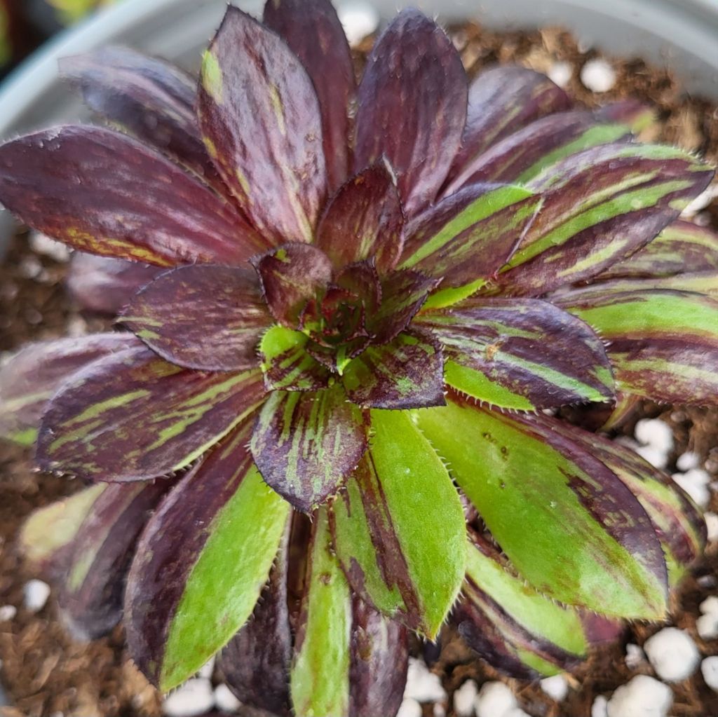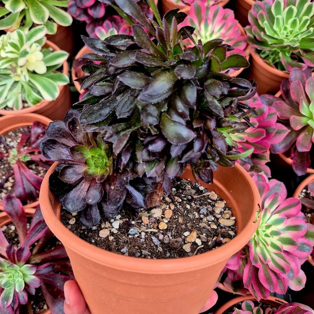 Cet Aeonium variegata étant assez récent, nous n’avons pas encore d’informations fiables sur sa vitesse de pousse, sa capacité à rejeter et une éventuelle fragilité.